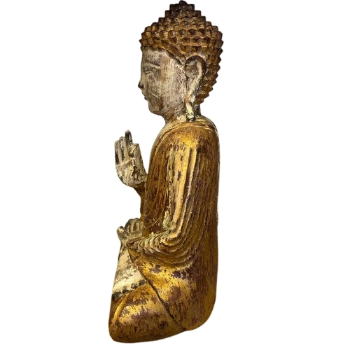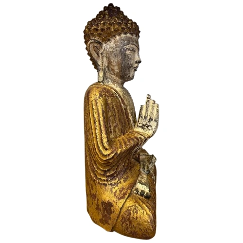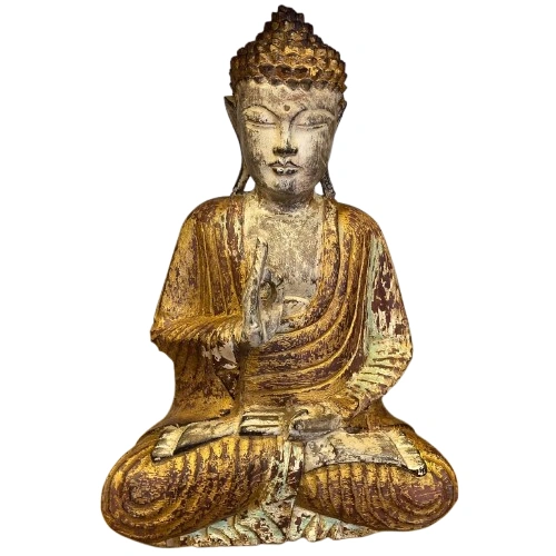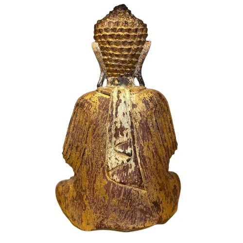 This beautifully handcrafted Buddha statue by Shaman Kathmandu embodies tranquility, mindfulness, and traditional artistry. The statue features a serene facial expression, detailed textured hair, and an orange robe with intricate carved folds that highlight the craftsmanship behind the piece. Its antique-style finish adds depth and character, making it a timeless addition to your home décor, meditation area, or spiritual setting.