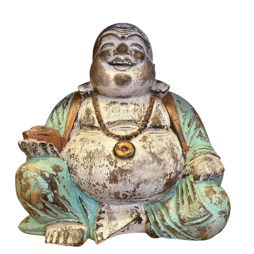 Crafted with meticulous detail, this statue features a beautiful weathered finish, soft turquoise tones, and a serene smiling expression that symbolizes happiness and contentment. The Buddha is seated in a meditative pose, holding a prosperity bowl and wearing a traditional bead necklace—representing wealth, blessings, and inner peace.