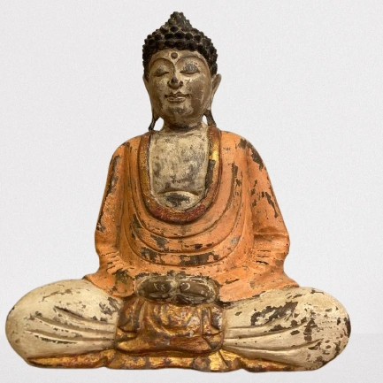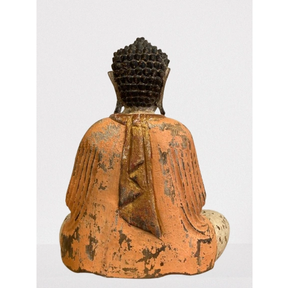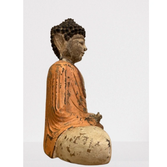 This beautifully handcrafted Buddha statue by Shaman Kathmandu embodies tranquility, mindfulness, and traditional artistry. The statue features a serene facial expression, detailed textured hair, and an orange robe with intricate carved folds that highlight the craftsmanship behind the piece. Its antique-style finish adds depth and character, making it a timeless addition to your home décor, meditation area, or spiritual setting.